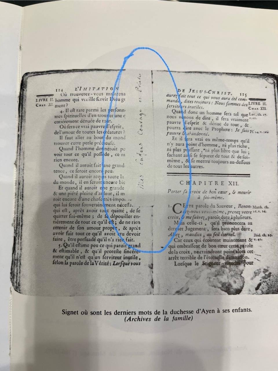Conciergerie: Quando foram buscá-la, a Duquesa d’Ayen lia a Imitação de Cristo, de Tomás de Kempis. Ela escreveu rapidamente uma mensagem para marcar o lugar onde parara a leitura. A mensagem (vide imagem abaixo) dizia: “Meus filhos, coragem e oração” (Mes enfants, courage et prière). Mãe é mãe. Beijou o livro e o deixou com a Duquesa de Orleans (bisavó do Conde d’Eu, marido da nossa Princesa Isabel), reclusa a alguns passos dela. A queda de Robespierre salvou a Duquesa de Orleans, que cumpriu esse último pedido: o livro e a frase dramática continuavam sendo cuidadosamente guardados pelos descendentes da Duquesa d’Ayen, como relata G. Lenotre em seu belo livro Le Jardin de Picpus, em que conta a história da fase do Grande Terror da Revolução Francesa, e que usei como base destas Notas.