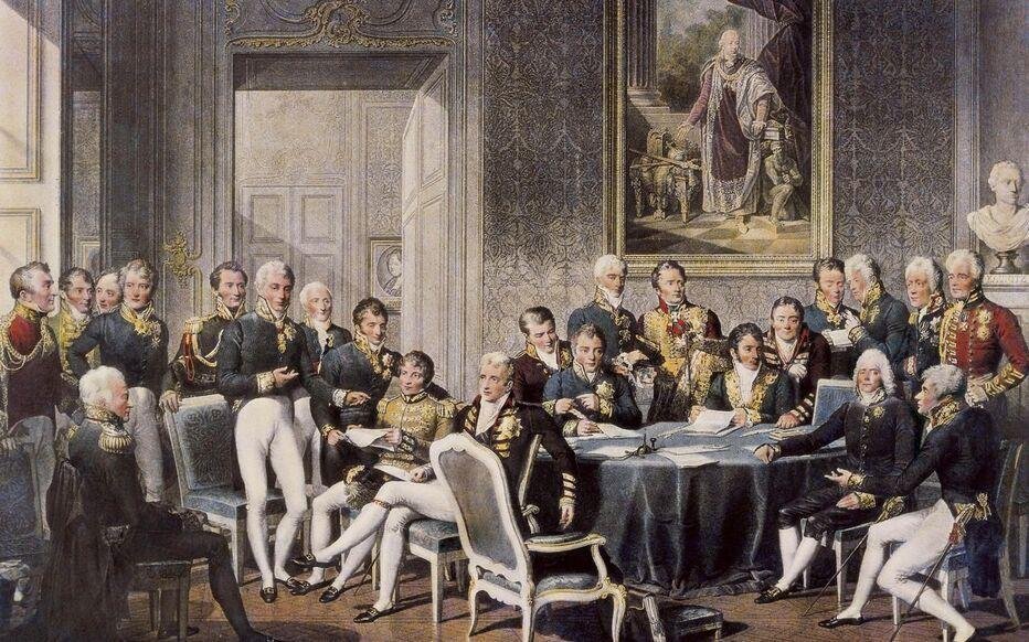 Congresso de Viena. Talleyrand é o segundo sentado, no canto direito. O quadro mostra, no canto esquerdo, o Duque de Wellington (de vermelho) sendo apresentado ao Congresso (pintura de Jean-Baptiste Isabey, 1850)